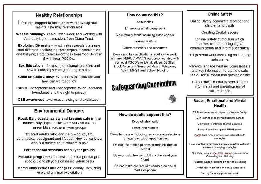There is a planned curriculum for safeguarding. This teaches your children how to keep themselves safe and what to do if any adult makes them feel unsafe. This curriculum is created from the work of Childline, NSPCC, and NSSCP‘s booklet entitled ‘Adults who work with me’ and a range of other agencies that support our Safeguarding in school.